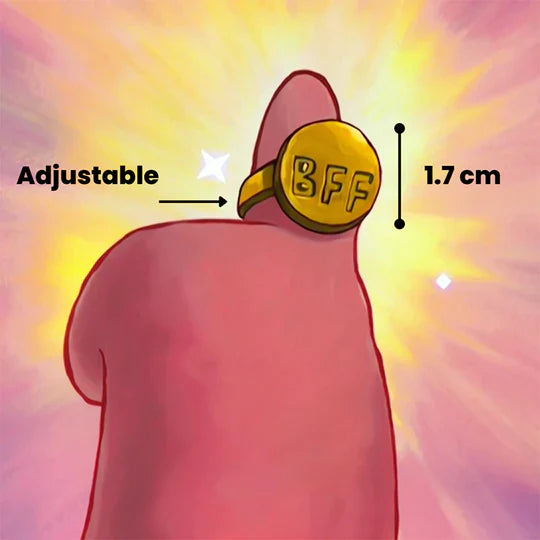 Ben je klaar om lid te worden van de BFF club? Onze exclusieve The-BFF™ ring is een fan-favoriet stuk dat een exacte replica is van de show! De BFF ring is perfect voor jou en je vriend om jullie hechte vriendschap te vertegenwoordigen zoals die van Sponge en Pat. Het opent, sluit en draait net als in de serie! Laat je beste vriend(in) zien hoeveel ze voor je betekenen met de BFF ring, net als in de serie.